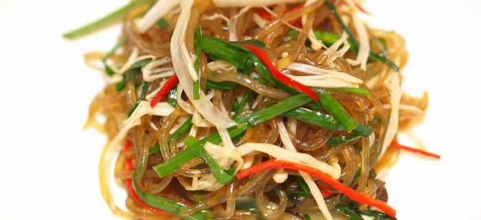 Meaning “mixture of vegetables,” japchae describes both the dish as well as the method with which it is prepared. Generally, the term refers to vegetables (namul) stir-fried with meat. To make the dish, glass noodles made from sweet potato starch (dangmyeon) are stir-fried in sesame oil with beef and thinly sliced vegetables and seasoned with soy sauce and a touch of sugar.